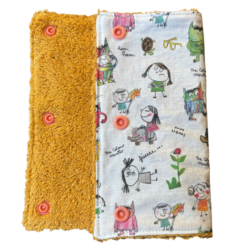 Aquest producte fa 15x7cm, i està fet de teixit de tovallola de cotó absorbent per recollir les babes de l’infant i les seves mossegades, i tela de cotó estampat que li donarà personalitat i diversió al porteig.